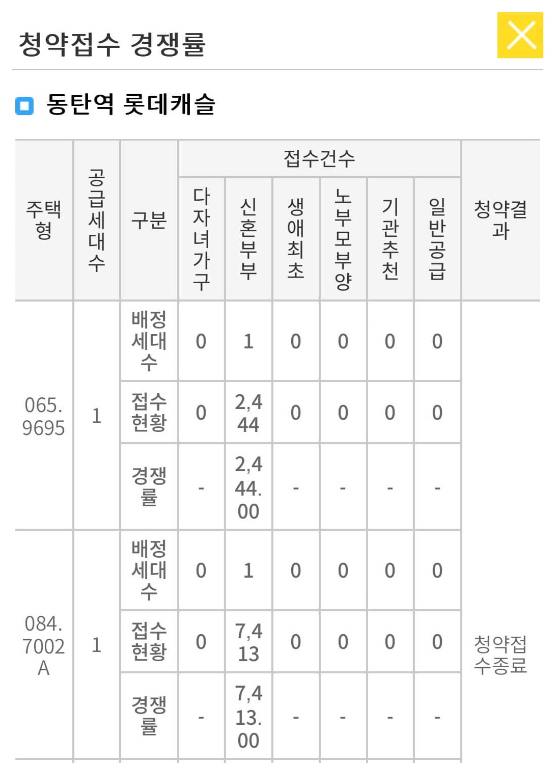 동탄역 롯데캐슬의 신혼부부 특별공급은 총 2세대의 청약 신청을 받았으며 경쟁률은 아래와 같습니다.