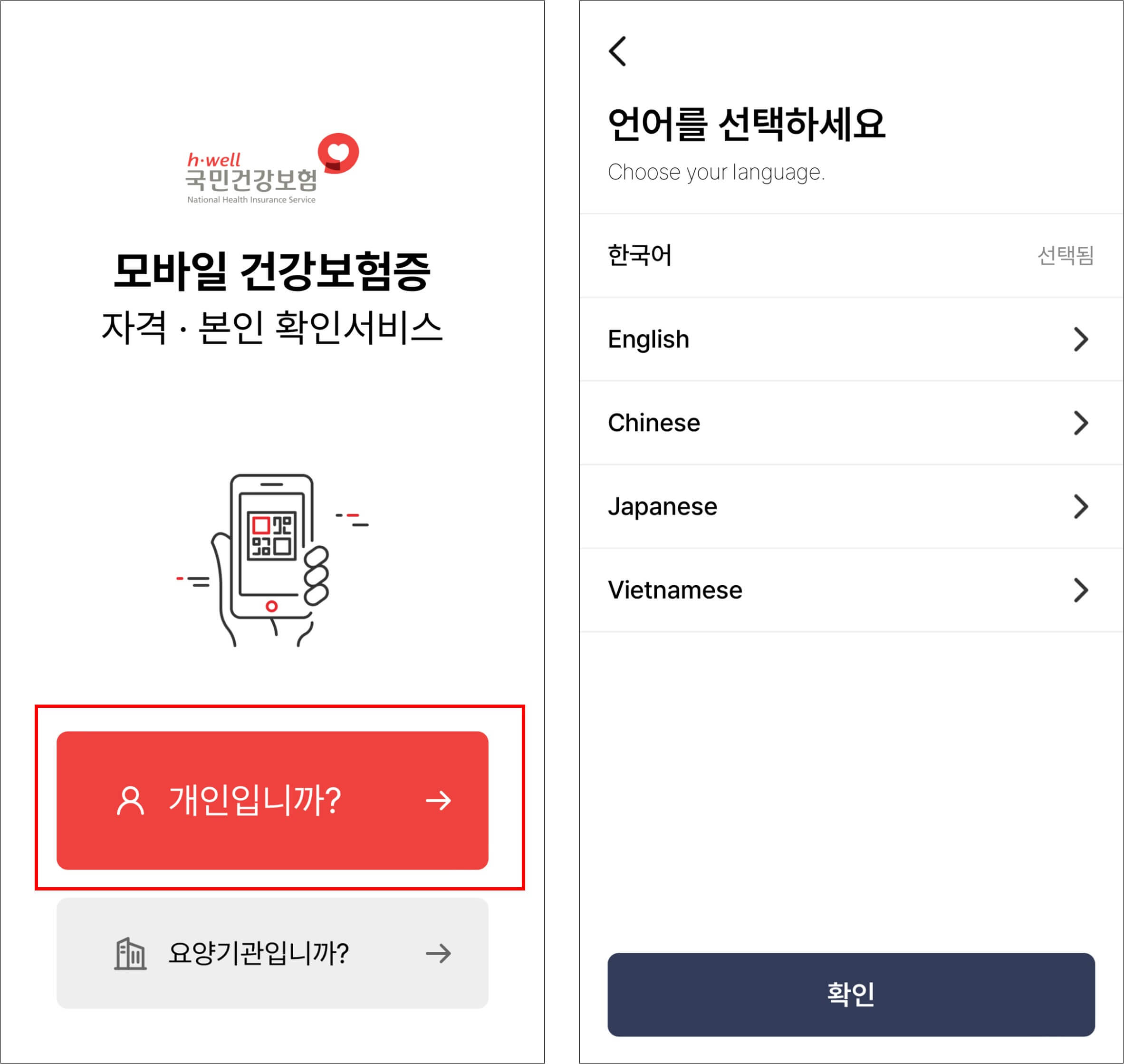 Step1. 모바일 건강보험증을 설치하신 후 [개인여부] 및 [언어]를 선택합니다.
