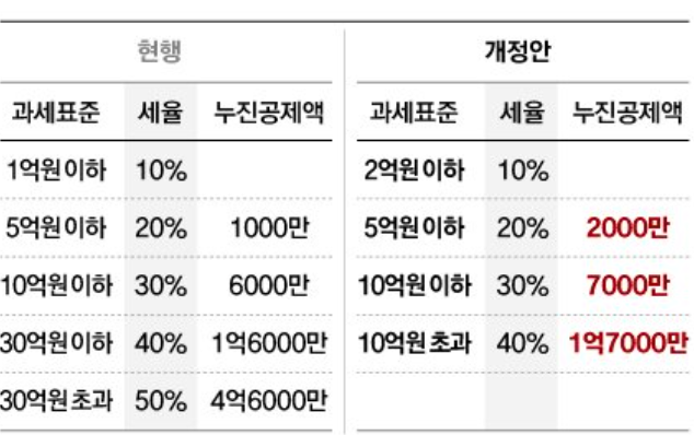 - 10% 상속세를 과세표준 금액: 1억 → 2억 원
