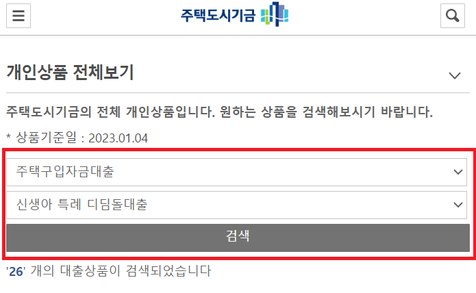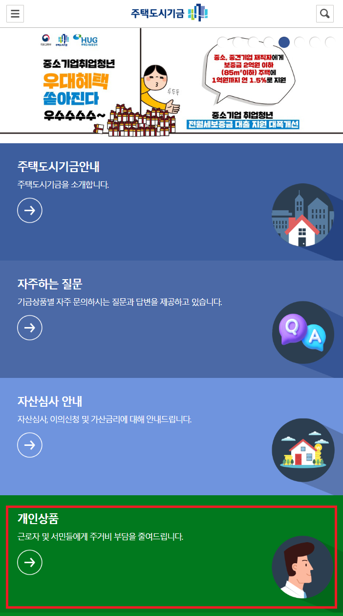 Step1. 주택도시기금 홈페이지 접속 후, [개인상품]을 선택합니다.