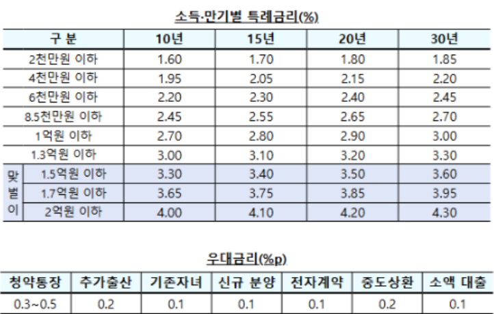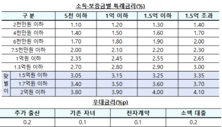 | 맞벌이 | 1.5억원 이하 | 3.05 | 3.15 | 3.25 | 3.35 |