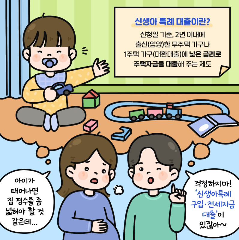 주택 구입 자금과 전세 자금을 저금리로 빌려주어 신생아 출산 가정의 주거 안정을 돕는 것을 목적으로 하는데요.