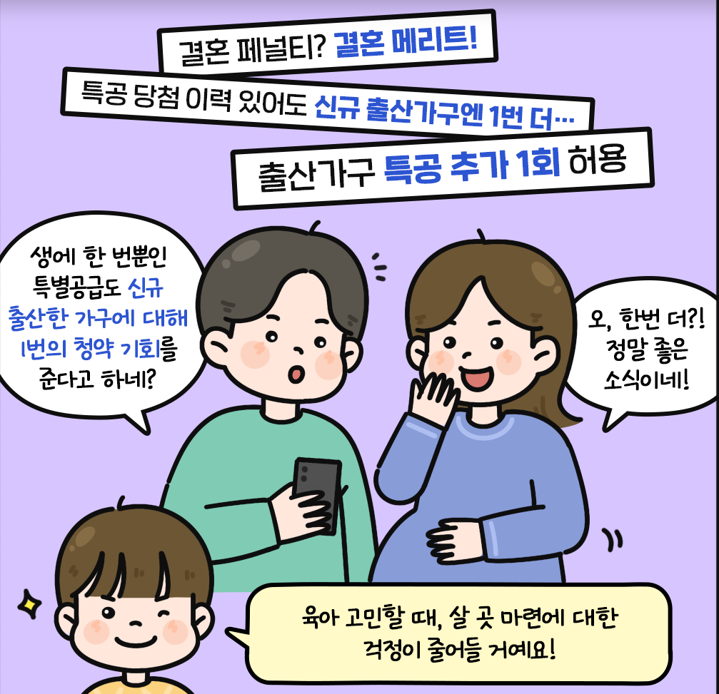 기존에 생에 한 번만 가능했던 특별공급도 신규 출산한 가구에 대해서는 1번의 청약 기회를 더 부여합니다.