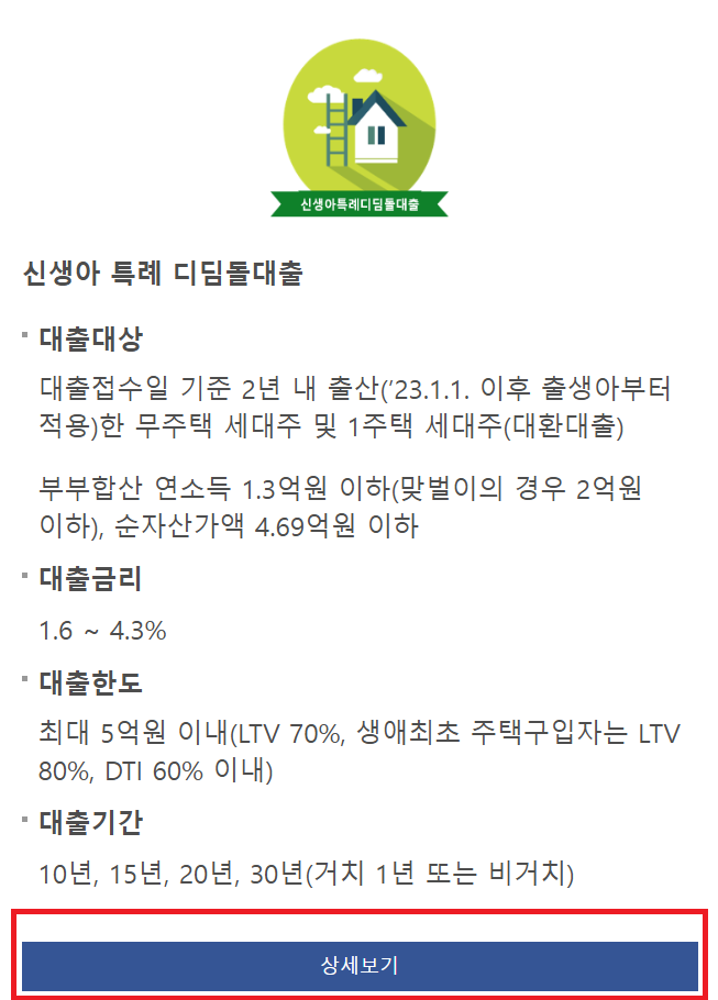Step3. 신생아 특례 대출의 대상, 금리, 한도, 기간 등을 간단하게 확인하신 후 [상세 보기]를 선택합니다.
