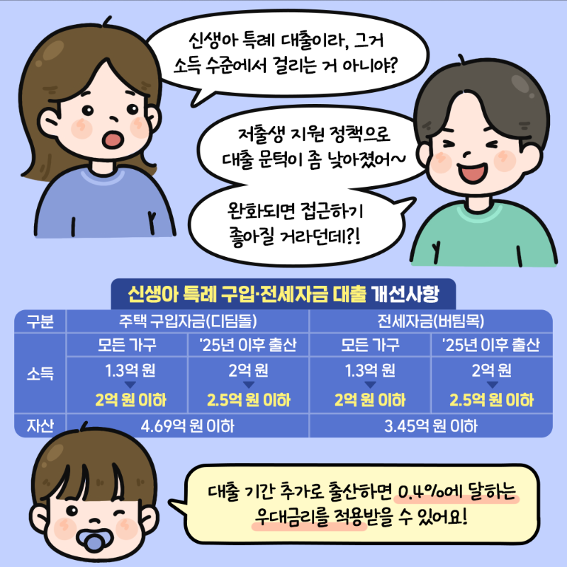 또한 25년 이후 출산 예정자는 2.5억원 이하도 대출이 가능해졌는데요. 이를 통해 더 많은 가구가 혜택을 받을 수 있게 되었습니다.