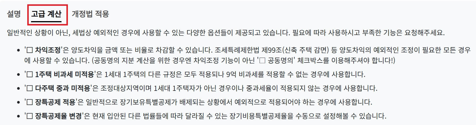 계산기에서 이를 선택하면 '차익조정', '1주택 비과세 미적용', '작특공제율 변경' 항목이 새로 생김을 알 수 있습니다.
