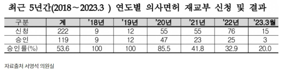 의사면허의 재교부 승인 비율은 19년도까지는 100%로 유명무실하였지만 20년도부터 낮아지기 시작하여 23년에는 20%로 급감하였습니다.