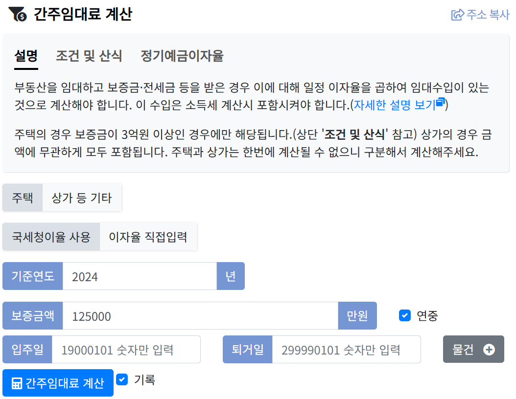 간주임대료는 아래의 간주임대료 계산기를 통해 간편하게 확인하실 수 있으며 이자율은 3.5%입니다.