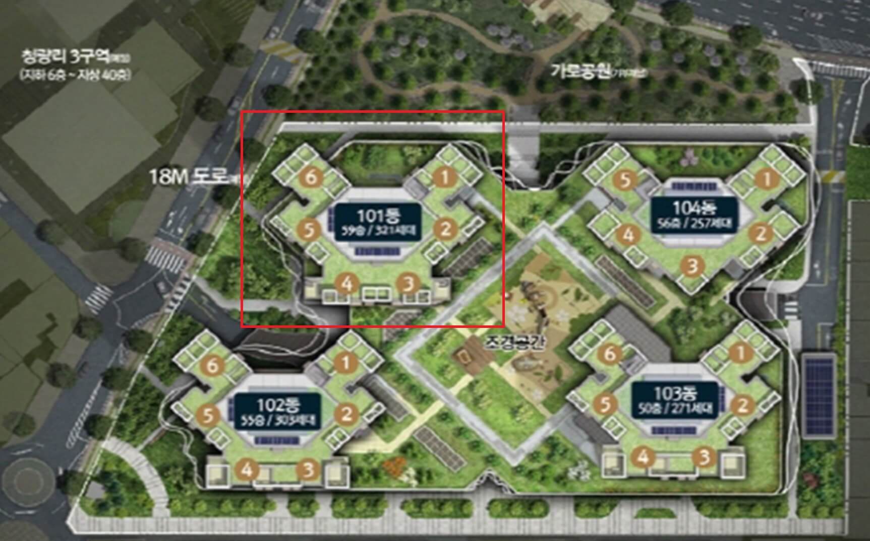 이번 무순위 줍줍으로 나온 101동은 가로공원 인접해 있으며 단지 내에서 지하철 역하고도 가장 가까운 좋은 위치입니다.